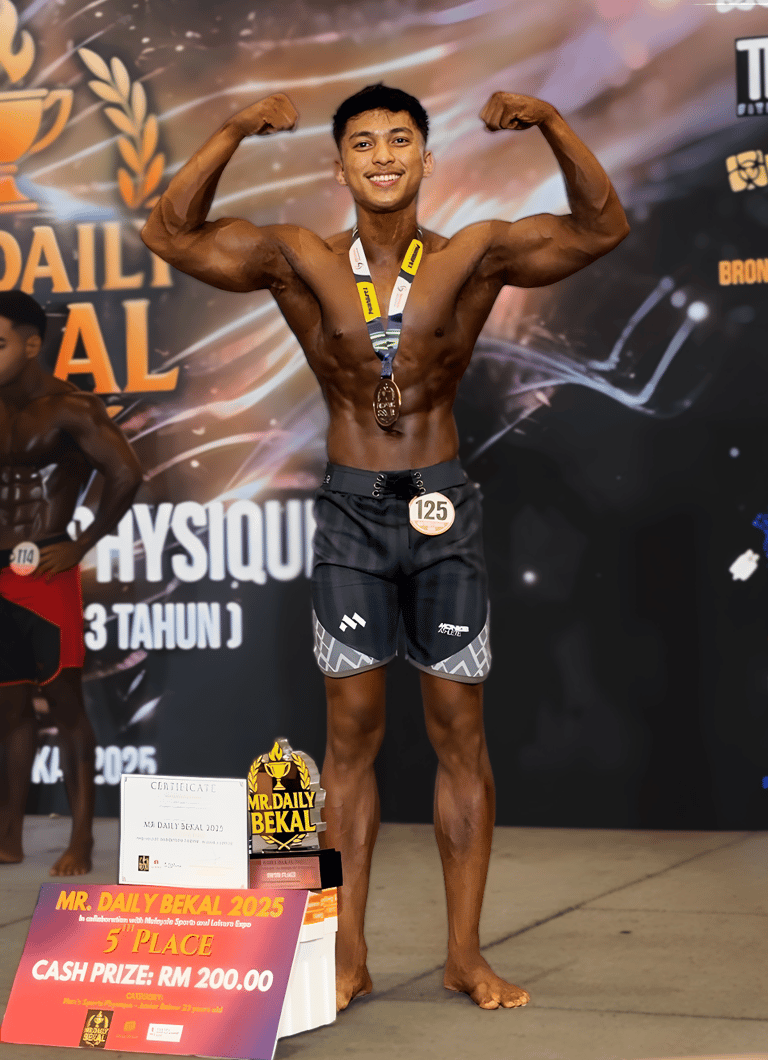 Rising fitness athlete Haikal Iman made his mark by finishing 5th in the Daily Bekal Men’s Physique Junior U23 competition at Mid Valley Megamall. a major milestone in his physique journey.